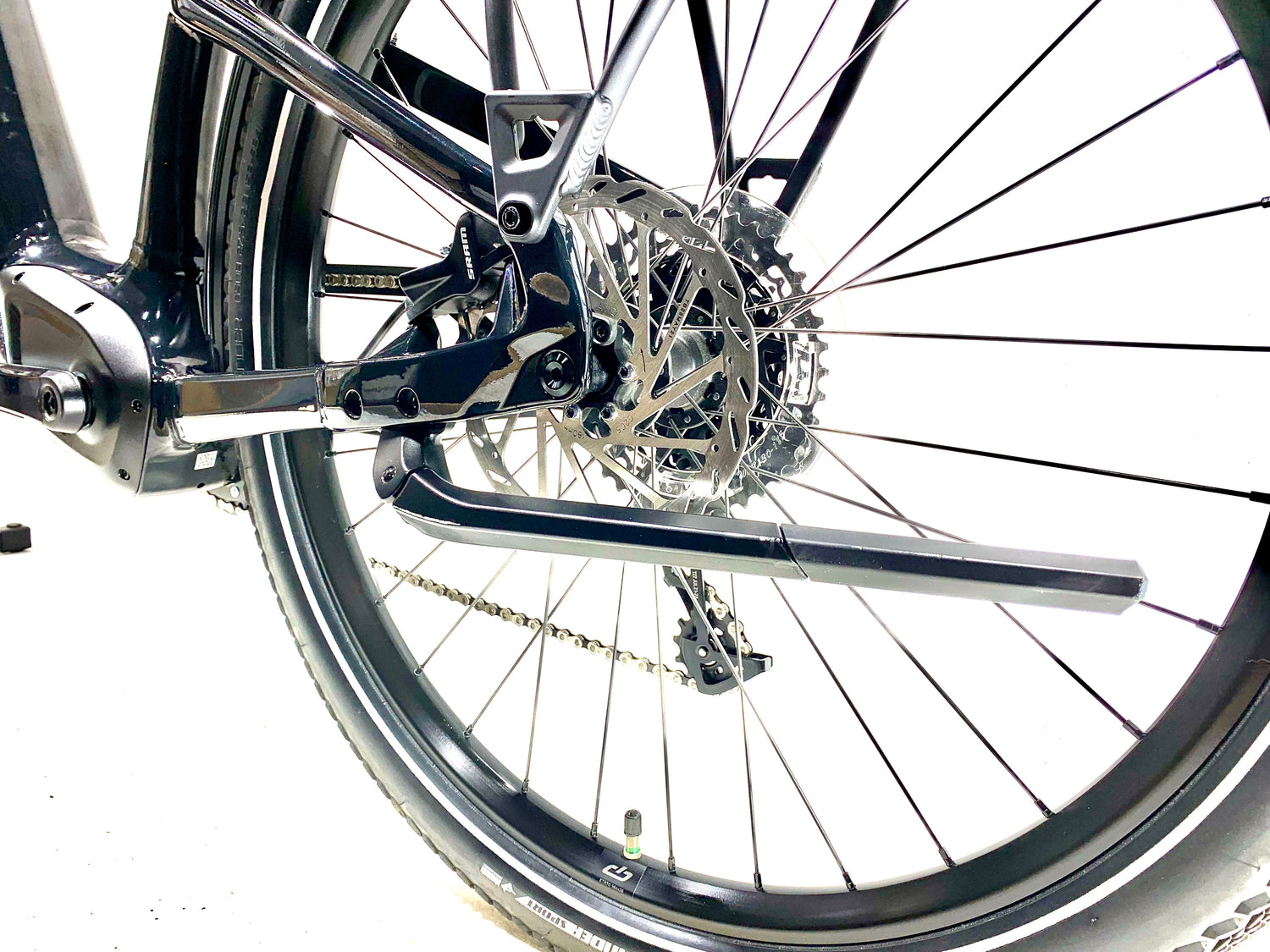 Equipped with DRYTECH Fenders, LED front and rear lights, and 27kg capacity rear HD Rack. The rear rack is compatible with child bike seats, and the bike is also rated to pull a thru-axle trailer.